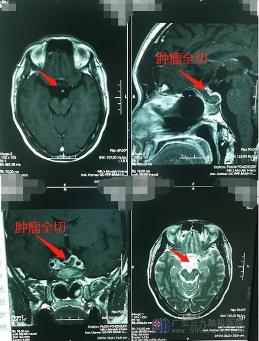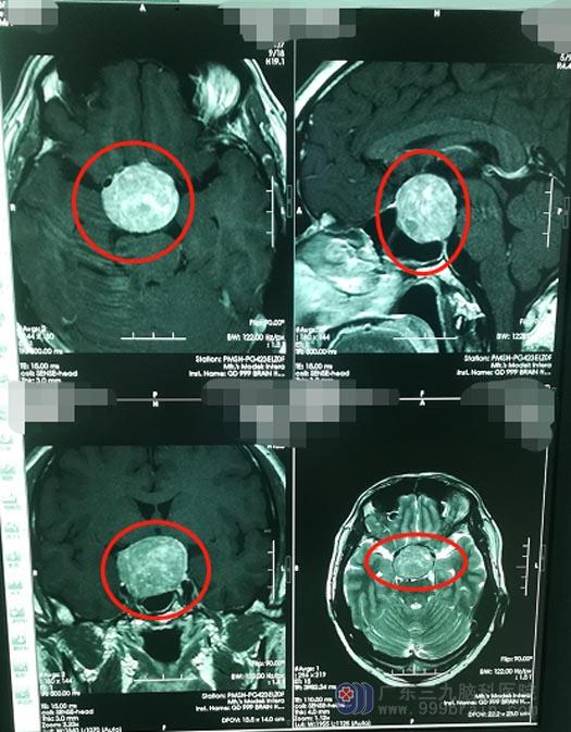 第二天,吴先生就急急忙忙地赶到了广东三九脑科医院神经外五科,进一步的脑部检查发现:鞍区示一类圆形占位性病变,呈长T1不均长T2异常信号影,增强(1.5T)增强后病变明显强度,范围约为4.0cm×3.5cm×3.3cm,视交叉受压上抬显示不清,邻近双侧颈内动脉局部稍包埋;诊断为鞍区占位性病变,考虑垂体大腺瘤。