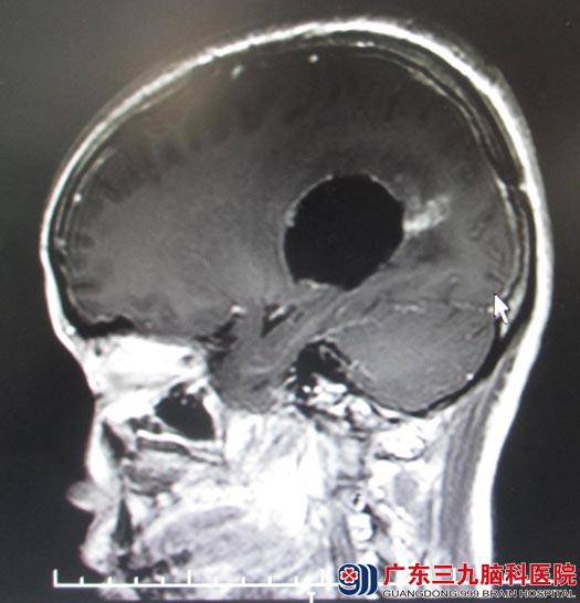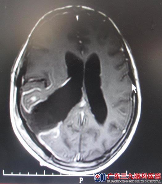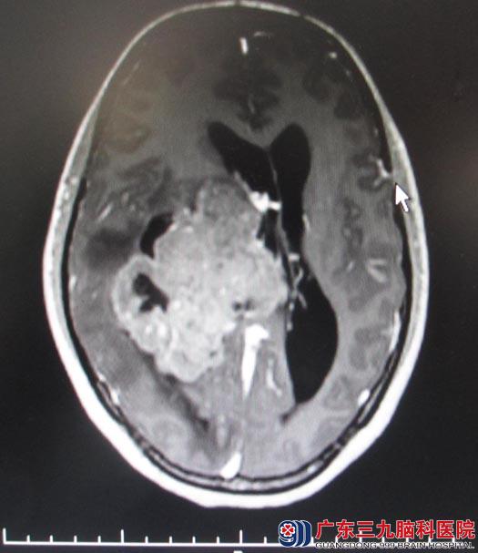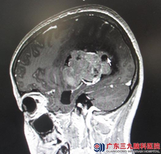 四月份曾在广东三九脑科行颅脑MR检查,示:右侧侧脑室三角区巨大占位性病灶,考虑肿瘤性病变。后入住综合神经外科,复查颅脑MR显示:1、右侧侧脑室三角区及周围巨大占位病灶,大小约7cm×9cm,考虑室管膜瘤、中枢神经细胞瘤或PNETs(原始性神经外胚层瘤)可能;2、右侧大脑镰下疝,右侧海马钩回疝,小脑扁桃体轻度下疝;3、空泡蝶鞍。肿瘤挤压对侧脑室,中线左移。