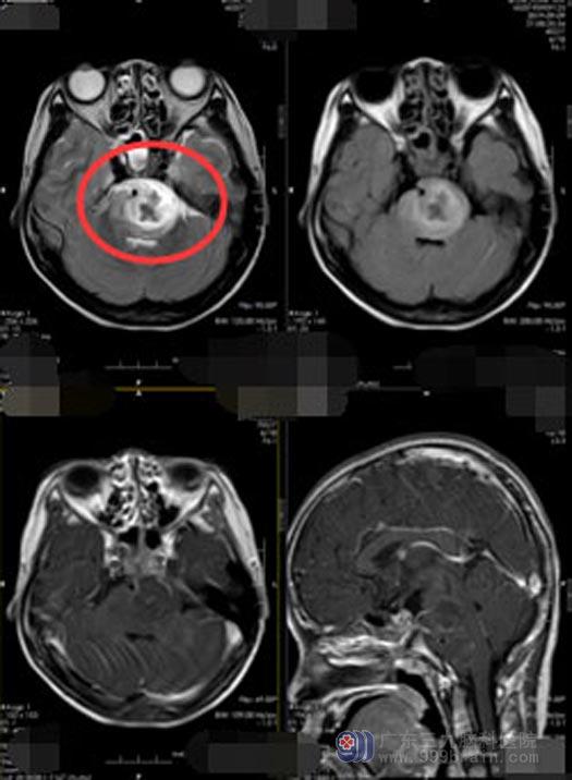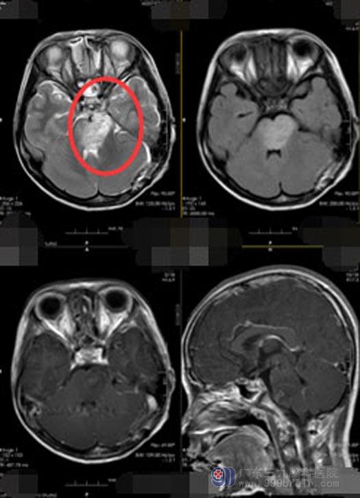 一向活泼乖巧的小梅从几天前开始就没精神,感觉右手和右脚没力气,而且吃啥吐啥。妈妈觉得入秋后天气多变,抵抗力容易下降, 11岁的孩子大概是感冒了。当地诊所医生没发现孩子有感冒症状,建议头部CT扫描,一检查还真发现了问题:脑干占位性病变,脑干明显肿胀,其内周围有块状占位性病变,显示高低混杂信号,包绕基底动脉,最大层面病状范围4.6cm×3.0cm,四脑室受压明显。