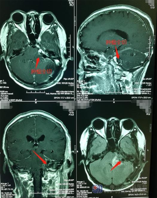 医院副院长、神经外五科主任鲁明带领治疗团队慎重地术前讨论后,由鲁明主刀为徐阿姨行“左侧桥小脑角占位切除术”,术中见肿瘤位于左侧桥小脑角区,血供丰富,肿瘤与面神经粘连,术中采用电刺激辨认面神经,保护了面、听神经功能,显微镜下分块将肿瘤全部切除,术程顺利。