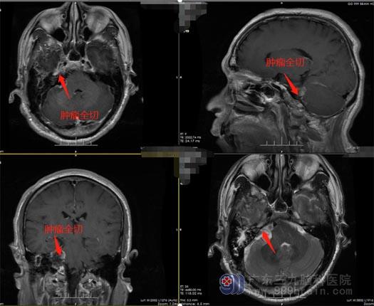 广东三九脑科医院鲁明副院长、神经外五科王国良主任高度重视钟先生的病情,反复讨论后一致同意手术治疗,而手术治疗的难点在于:手术既要切除肿瘤,又要保住患者的神经功能。患者听神经、面神经位于肿瘤的前下方,不仅位置很深,且周围结构复杂,在如此狭小的空间里,要想取出肿瘤,难度和风险可想而知。稍有差池,便会损伤颅神经、脑血管。很快,神经外五科团队为钟先生实施了右侧听神经瘤切除术。术中,医生从患者后侧行8厘米切口,见肿瘤位于右侧桥小脑角,予显微镜下全切肿瘤。术后钟先生神志清醒,因术中各组颅神经保护良好,钟先生无明显颅神经损伤的阳性体征表现,恢复良好。