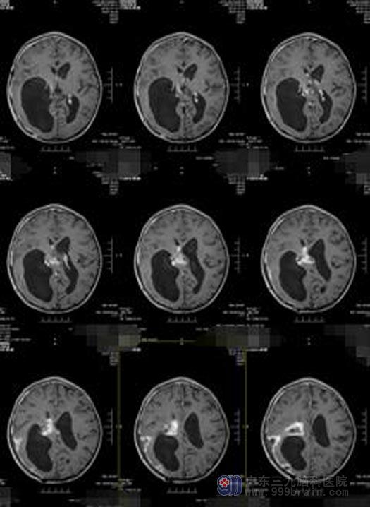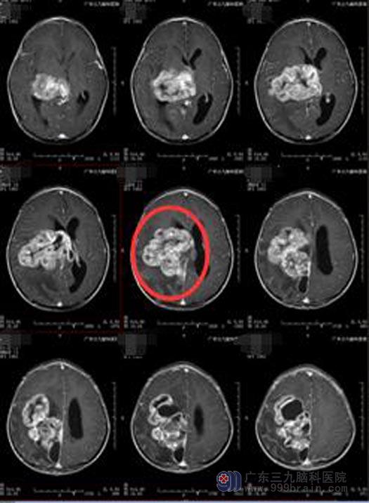 头颅CT提示:右侧丘脑-额顶叶巨大占位性病变,考虑肿瘤病变可能性大。由于手术难度非常大,小琪父母经多方打听,来到广东三九脑科医院综合神经外科。入院后,立即进行了进一步的检查:右侧丘脑-额顶叶囊实性占位性病变,病变范围约为8.4cm×7.1cm×8.7cm。