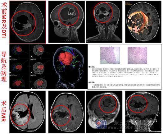 入住综合神经外科,进一步头颅MRI显示:1.右侧颞叶-丘脑巨大占位性病变,范围约为7.2cm×7.5cm×7.3cm,考虑为恶性肿瘤,胚胎性肿瘤或间变室管膜瘤可能,并可疑脑脊液播散转移;2.右侧大脑镰下疝形成;右侧海马钩回疝形成。