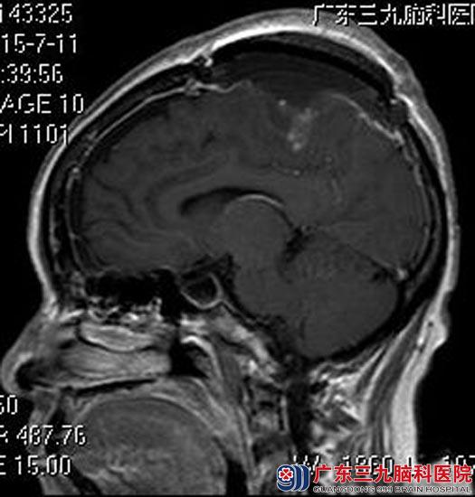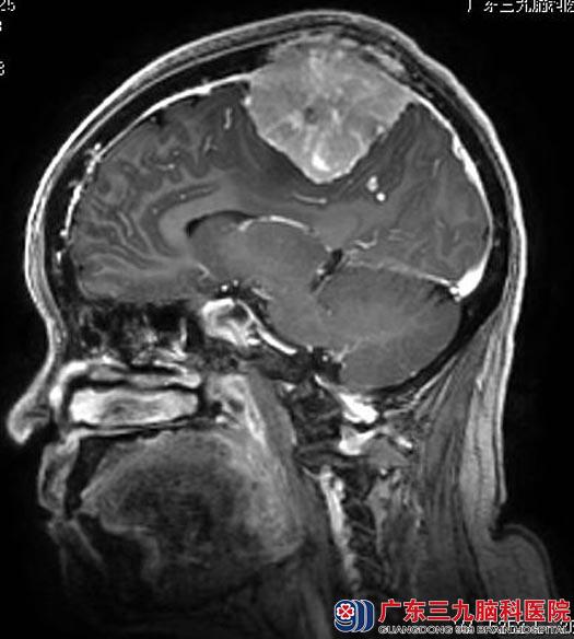 家属联系到广东三九脑科医院综合神经外科鲁明主任。进一步头颅MR检查显示:额顶部镰旁双侧(右侧为主)占位性病变,大小约66.1mm×57.1mm×56.4mm,考虑脑膜瘤可能性大。
