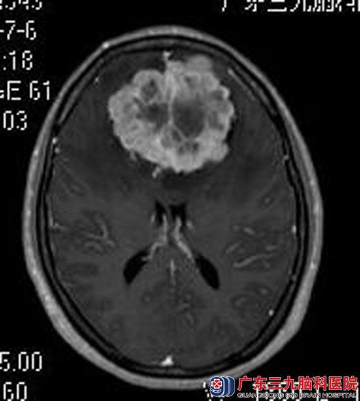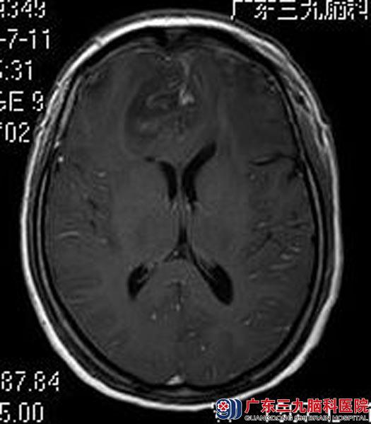此后她的右眼视力逐渐下降,一个月前右眼视物不清,当地医院行头颅CT检查提示双侧额部大脑镰巨大占位。住院广东三九脑科医院综合神经外科。查体发现:陈女士右眼只剩光感,直接对光反射消失,间接对光反射迟钝,左眼视力4.2,直接对光反射迟钝,间接对光反射消失;行头颅MR检查提示:双侧额部镰旁占位性病变,约6.5cm×6.4cm×5.7cm,考虑脑膜瘤。