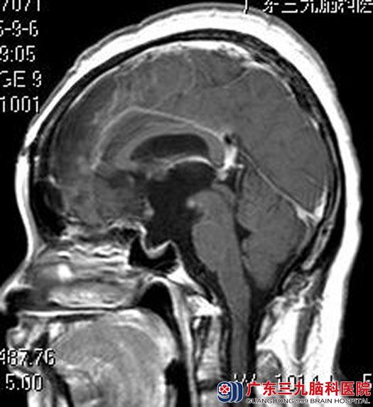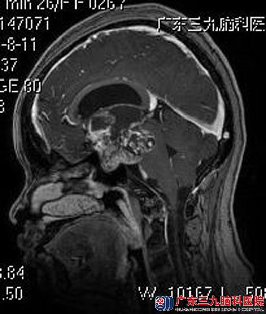 广东三九脑科医院MR检查提示:鞍区示一不规则形囊实性占位性病变,4.7cm×3.9cm×3.7cm;病变向上突入第三脑室,向后推压脑干受压变形。垂体明显受压变薄,视交叉及垂体柄受压显示不清。考虑颅咽管瘤可能性大,伴幕上梗阻性脑积水(轻度)。