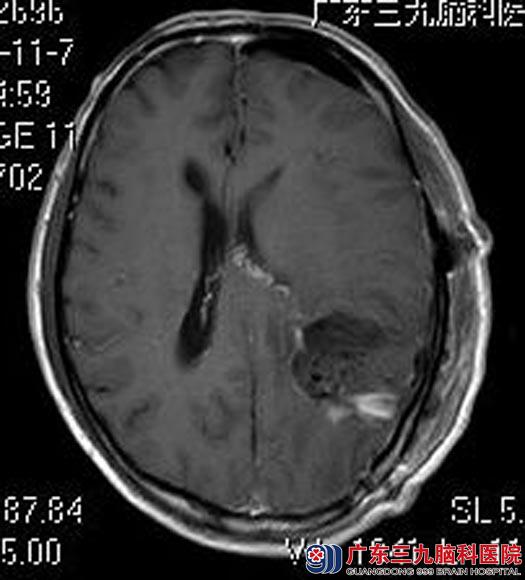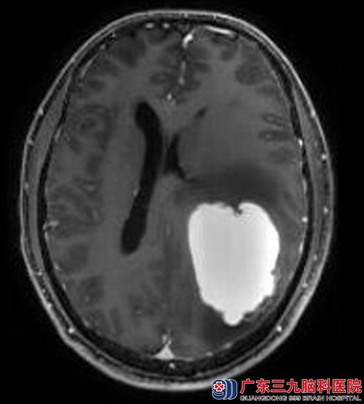 为进一步了解病情,林先生来到广东三九脑科医院,MR检查提示:左侧颞顶叶示类圆形病灶,大小约5.3cm×4.0cm×5.5cm,可疑肿瘤卒中。