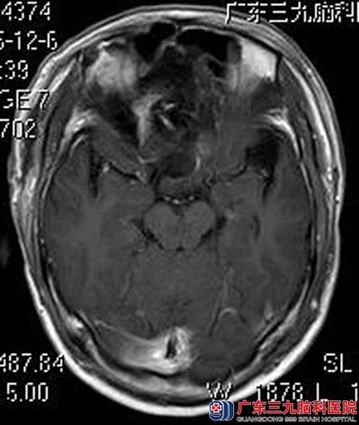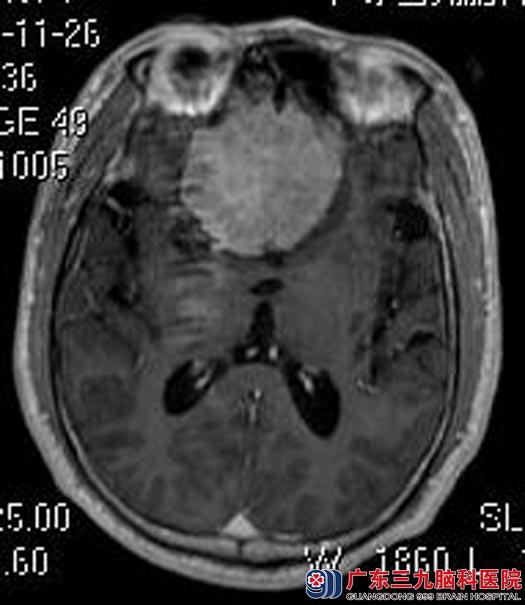 入住广东三九脑科医院综合神经外科,头颅MR检查提示:前颅窝底示一团块状占位性病变,大小约5.5cm×5.2cm×3.4cm,考虑脑膜瘤;头颅CTA检查提示:双侧大脑前动脉A1、A2段受压向后上方移位,双侧大脑前动脉额极支被病灶包绕。