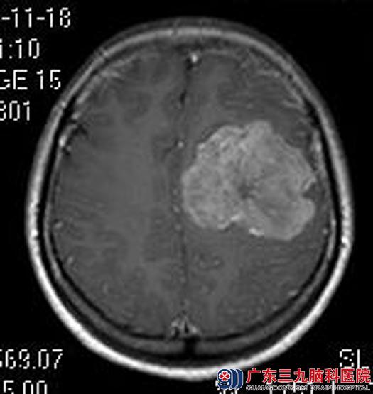 入住广东三九脑科医院综合神经外科,头颅MRI示:左侧额顶部颅骨内板下示类圆形占位,大小约64.2mm×50.3mm×41.6mm,考虑脑膜瘤。