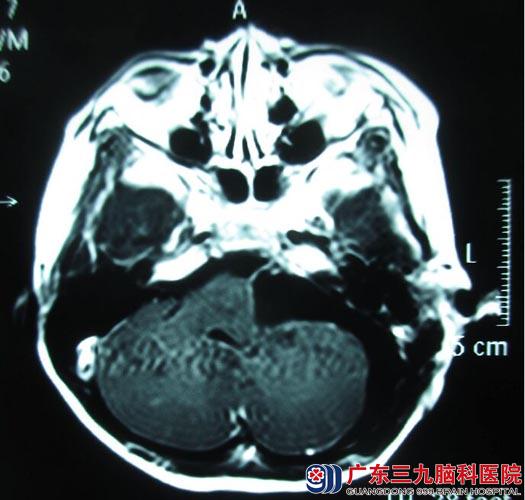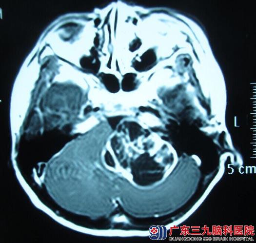 转诊到广东三九脑科医院综合神经外科,行头颅MR检查显示:左侧桥小脑角区占位性病变,大小约51mm×43mm×55mm,脑干、左侧桥壁及左侧小脑半球明显受压,考虑听神经瘤可能。