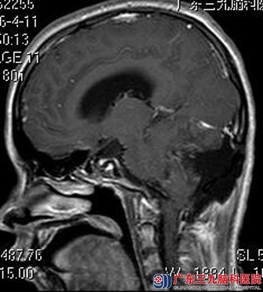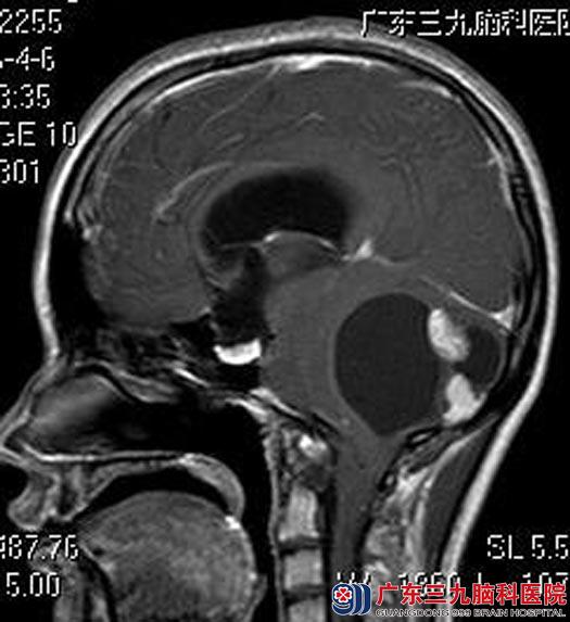 婷婷的父母立即带着她来到广东三九脑科医院,头颅MR检查提示:右侧小脑半球占位性病变,病灶大小约为6.6cm×5.8cm×5.1cm,增强后壁结节呈明显不均匀异常强化影,囊壁未见明显强化。四脑室受压变窄,脑干受压变形,小脑扁桃体变尖,向下疝入枕骨大孔,幕上脑室系统明显扩张,考虑毛细胞星形细胞瘤可能,待排血管母细胞瘤。