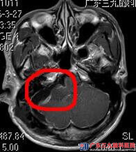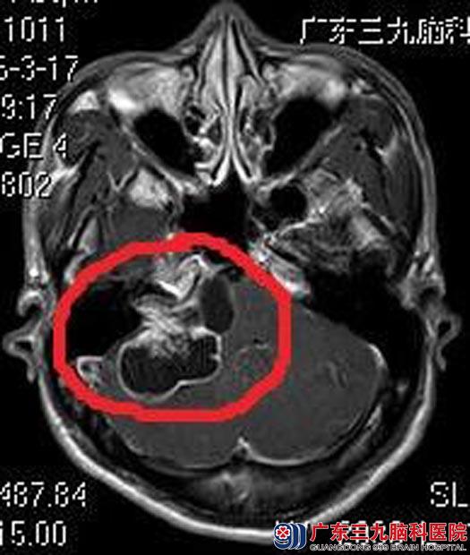 刘先生4个月前出现右耳吹风样响,休息后无明显好转,伴有听力下降,呈进行性加重,以为是工作精神压力大,在心理科就诊,头颅CT检查时发现:右侧桥小脑角占位性病变。