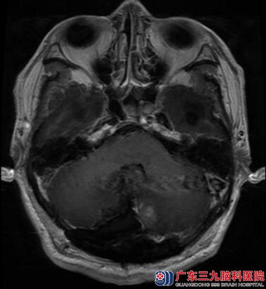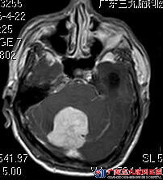 广东三九脑科医院进一步头颅MR检查提示:后颅窝小脑幕右侧幕下脑外占位性病变,大小约为4.1cm×4.7cm×4.2cm,考虑为脑膜瘤;并幕上梗阻性脑积水及小脑扁桃体下疝形成;头颅CTA提示:后颅窝右侧幕下占位性病变血管丰富。