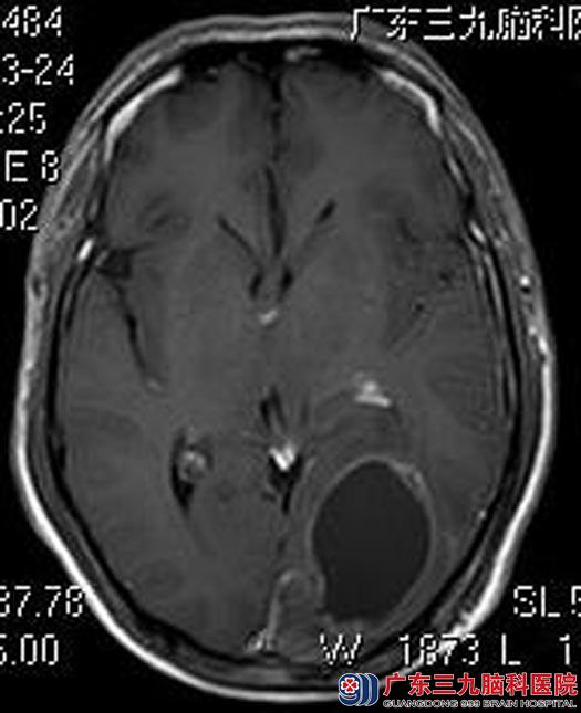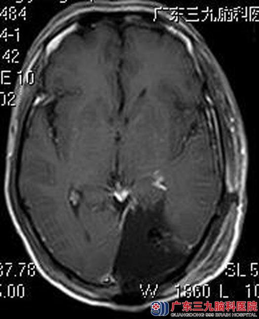 在广东三九脑科医院综合神经外科体格检查:精神食欲差,双侧瞳孔等圆等大,直径约2.5mm,对光反射灵敏,左眼视力4.7(0.5)、右眼视力4.5(0.3),双眼右侧偏盲。头颅MR检查显示:左侧顶枕部占位性病变,大小约3.8cm×6.4cm×5.9cm,考虑胶质瘤。