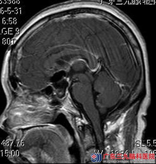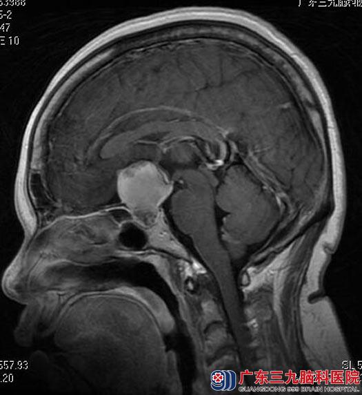 住院在广东三九脑科医院综合神经外科。头颅MR检查结果:鞍内及鞍上示一不规则异常信号影,范围约为2.4cm×2.7cm×3.1cm,考虑颅咽管瘤可能;头颅CTA检查显示:鞍区(鞍上为主)占位性病变,前交通动脉偏左侧囊状突起影,考虑动脉瘤(小型);内分泌检查报告:垂体前叶功能低下。予左甲状腺素口服治疗,两周后患者甲功基本正常。