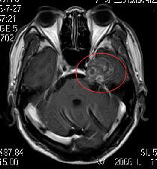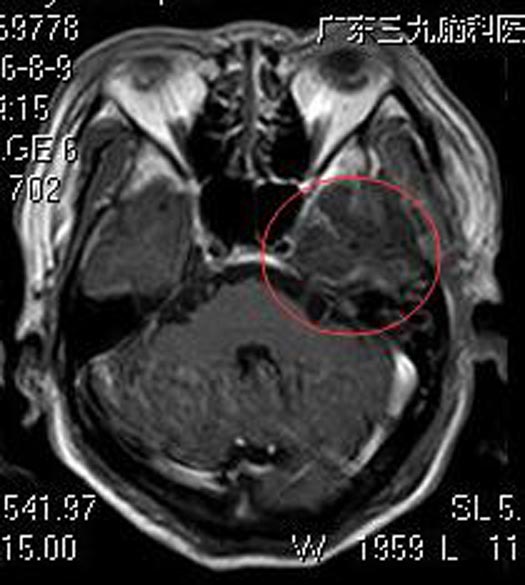 脑肿瘤可不是小事,儿女们认为不能再拖了。广东三九脑科医院头颅MR检查提示:左侧鞍旁三叉神经走行区占位性病变,病变边界清,与左侧三叉神经走行关系密切,大小约2.8cm×3.4cm,增强后病灶呈不均匀强化,其中示多个小环状强化灶,邻近左侧颞叶受压,考虑神经鞘瘤可能性大。
