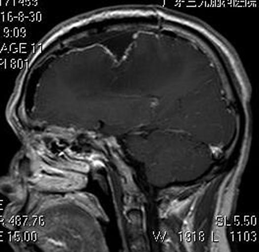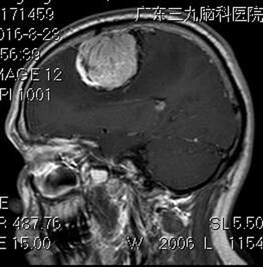 之后,头痛进行性加重,伴有左侧肢体乏力,当地医院头颅CT检查结果:右侧额部占位,考虑脑膜瘤。广东三九脑科医院头颅MR检查提示:左侧额部占位病变,大小约55.2mm×40.8mm×43.4mm,MRV示:病变区多发流空血管影,考虑脑膜瘤(血供丰富)。