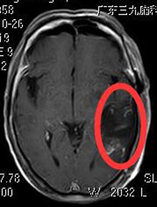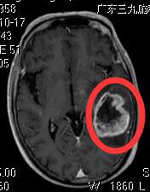 一个月前,潘爷爷出现咳嗽、感冒症状,伴头晕、头顶胀痛,间断低热,就近诊所治疗后,症状无明显改善。当地医院头颅CT检查提示颅内占位,广东三九脑科医院头颅MR检查显示:左侧颞叶占位性病变,大小约4.6cm×3.8cm×3.4cm,考虑胶质瘤可能性大。