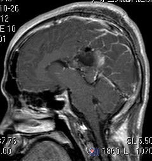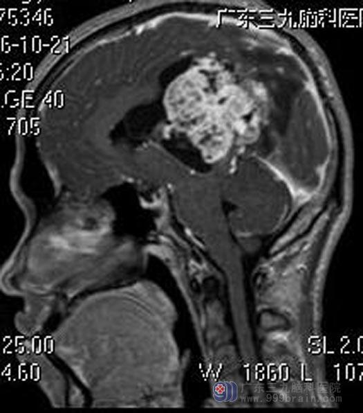 广东三九脑科医院进一步头颅MR检查提示:左侧丘脑-扣带回-侧脑室区示一团块状不规则囊实性占位性病变,病灶跨中线生长,大小约7.3cm×5.9cm×6.3cm,增强扫描病灶实性成分呈明显强化,囊性部分呈囊壁强化,邻近脑组织、脑干受压,首先考虑室管膜瘤或中枢神经细胞瘤,同时需注意脑外病变(囊性脑膜瘤)。