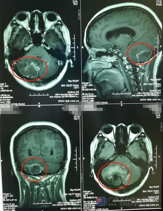 最近一段时间,蔡女士再次感到头痛,医生建议去专科医院进行进一步的治疗。广东三九脑科医院的头颅MRI检查显示:右侧小脑占位性病变,诊断为”右侧小脑半球转移瘤”。