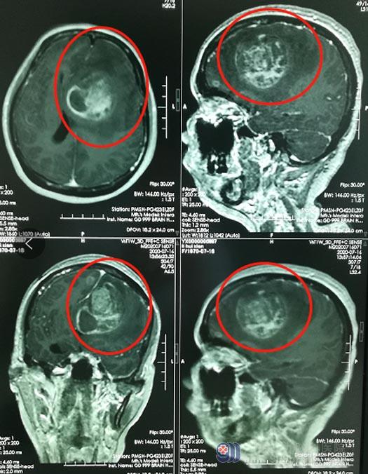 50岁的李阿姨,一个月前出现神志不清,并进行性加重,同时伴有右侧肢体乏力,后逐渐出现不能行走、不能言语、喷射性呕吐等症状,当地医院头颅CT检查提示“左侧额顶叶占位,伴出血,考虑肿瘤卒中”,肿瘤多发且体积较大,并且累及血管;看着一直在摇头的医生,家人决定立刻转院。