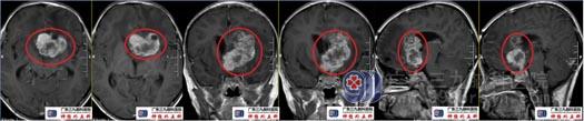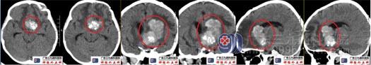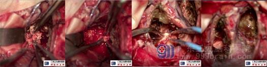 取原切口开颅,先沿着前纵裂分离,切除三脑室和鞍上肿瘤,可见肿瘤质地坚硬,钙化并包绕大脑前动脉,给予分块切除,直达鞍区;然后在额上回近纵裂处皮层造瘘切除左侧额叶及侧脑室内肿瘤,极少部分肿瘤与前交通动脉复合体黏连紧密,难以切除。