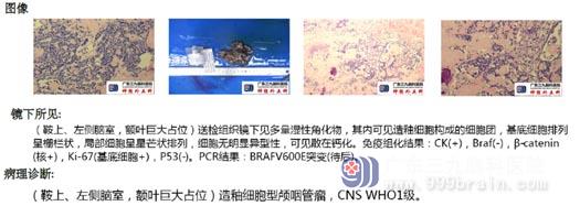 男,12岁。因颅咽管瘤术后放疗后7年余,复查头颅CT示肿瘤明显复发而入院。查体:身材矮小,发育迟缓。神志清楚,回答正确。左眼失明,右眼视力、视野尚可,余颅神经未见明显异常,四肢活动正常。口服垂体后叶素控制尿量。术前内分泌激素呈全激素水平低下,口服激素替代治疗。术前诊断:鞍上-左侧额叶-侧脑室前角颅咽管瘤切除术后复发、下丘脑-垂体功能低下、尿崩症。经补充激素治疗后在全麻下行肿瘤切除术。沿原切口切开头皮,取下原骨瓣,打开硬脑膜并翻向中线侧,轻轻分离前纵裂并向外侧牵开,显露鞍上肿瘤组织,予以分块摘除,直达鞍区;然后切开额上回,切除右侧额叶和脑室内的肿瘤组织。肿瘤基本全切除。术后病理诊断为造釉细胞型颅咽管瘤,WHO分级1级。术后肢体功能正常,左眼失明未恢复,余无特殊。出院后继续激素替代治疗。