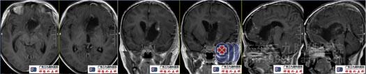 术前头颅MRI示左侧额颞部呈术后改变,鞍内术区示团块状各序列高信号为主的高低混杂异常信号影,大致同前,增强扫描边缘强化同前。鞍上-左侧额叶-侧脑室前角示团块状占位性病变范围较前增大,呈偏等T1、不均匀短T2异常信号影,间杂少许稍短T1信号,Flair序列呈等低信号,增强后明显强化,周围示片状长T1、长T2,Flair序列高信号影范围较前明显增大,累及双侧额叶、胼胝体及基底节区。幕上脑室扩张。中线结构居中。鞍上-左侧额叶-侧脑室前角颅咽管瘤术后较前明显增大,周围水肿明显进展。