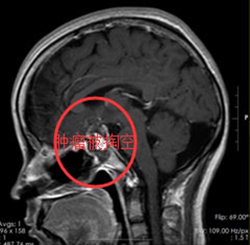 排除手术禁忌后,在内镜下行“经鼻蝶鞍区垂体瘤切除术+颅底重建术”,导航定位,全层切开硬脑膜,可见灰白色肿瘤流出,大小约3cm×2.6cm×0.7cm,囊肿组织,质软,易刮出,术程顺利。术后病理结果:垂体瘤。