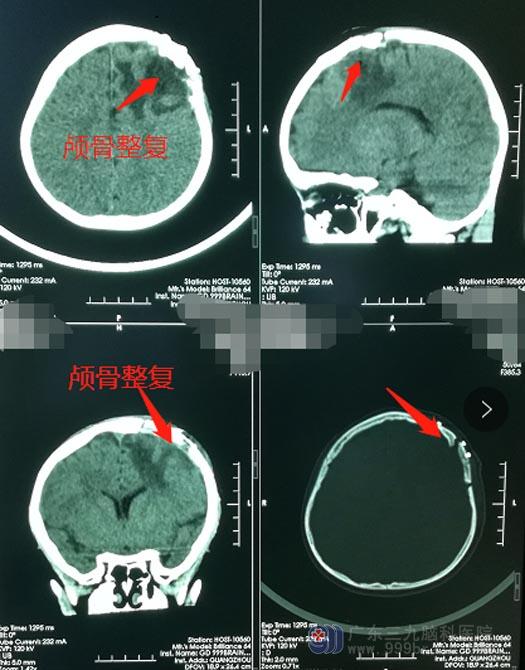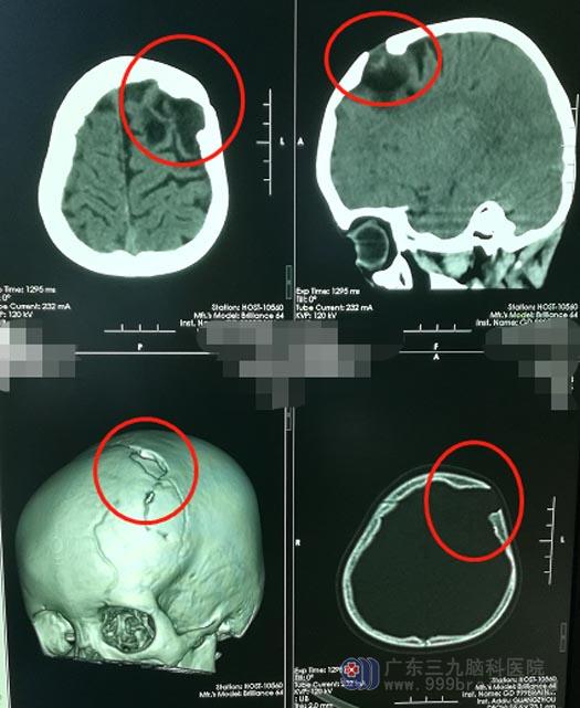 听了好友的介绍,他们带着鹏鹏来到了广东三九脑科医院神经外五科。查体时,医生发现鹏鹏左侧额部可触及一2.0cm×2.0cm大小的颅骨缺损、有搏动感。进一步头颅CT检查提示:1、额骨左侧局部骨质缺损,邻近左侧额叶软化灶形成并向外膨出,2、左侧额骨多发陈旧性骨折。主管医生结合鹏鹏之前的外伤史,考虑他是颅骨生长发育性骨折。