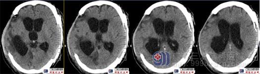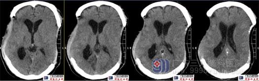 术前头颅CT示双侧额颞顶部局部骨质缺如,双侧术区脑组织内陷。