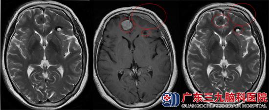 在朋友的介绍下找到了广东三九脑科医院的综合神经外科,头颅MR检查结果:1.双侧额部镰旁占位性病变,大小约为17.6mm×17.7mm×27.8mm,考虑脑膜瘤;2.左侧额叶海绵状血管瘤,大小约为12.3mm×11.2mm×7.9mm。3.左侧额部硬膜下小血肿: